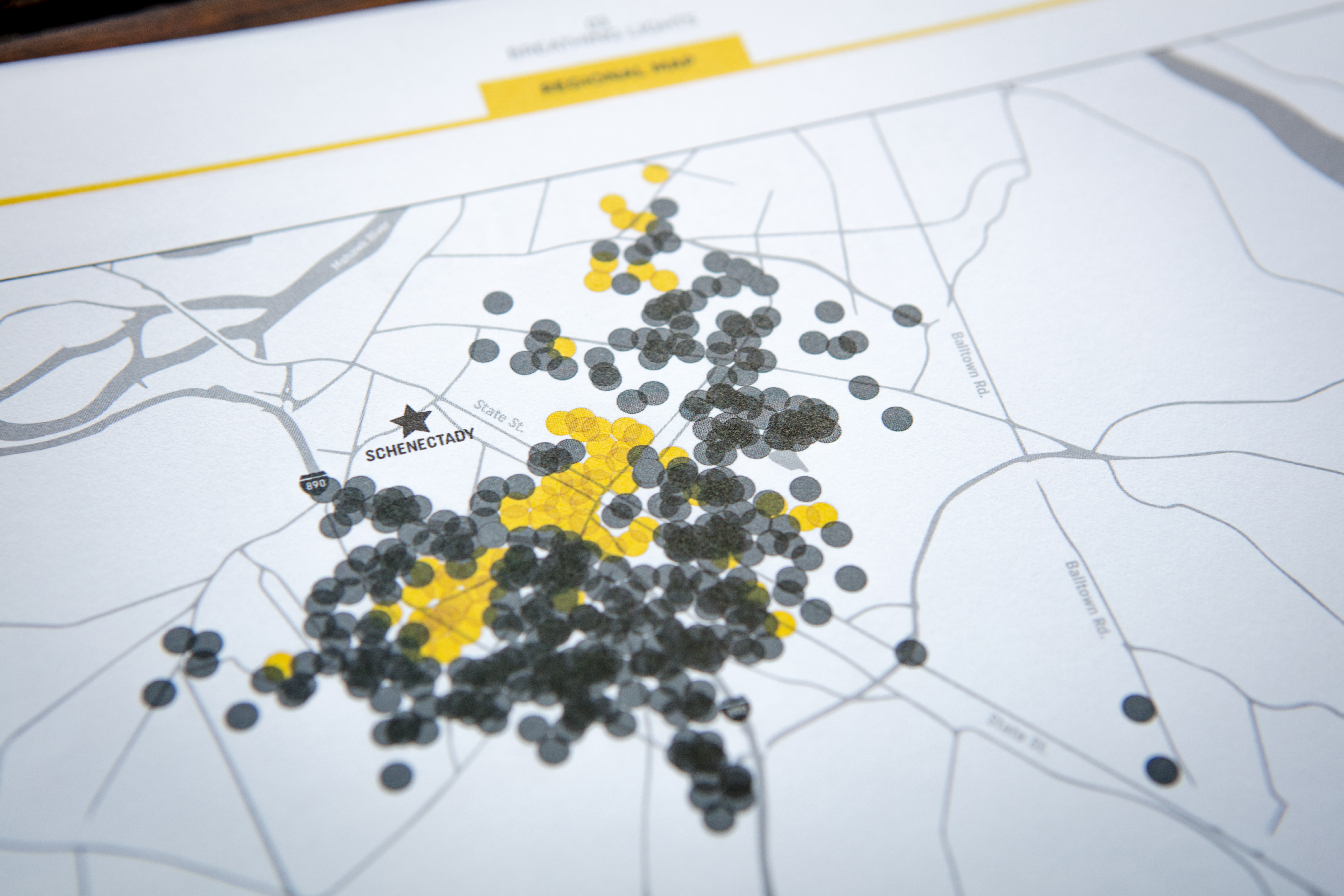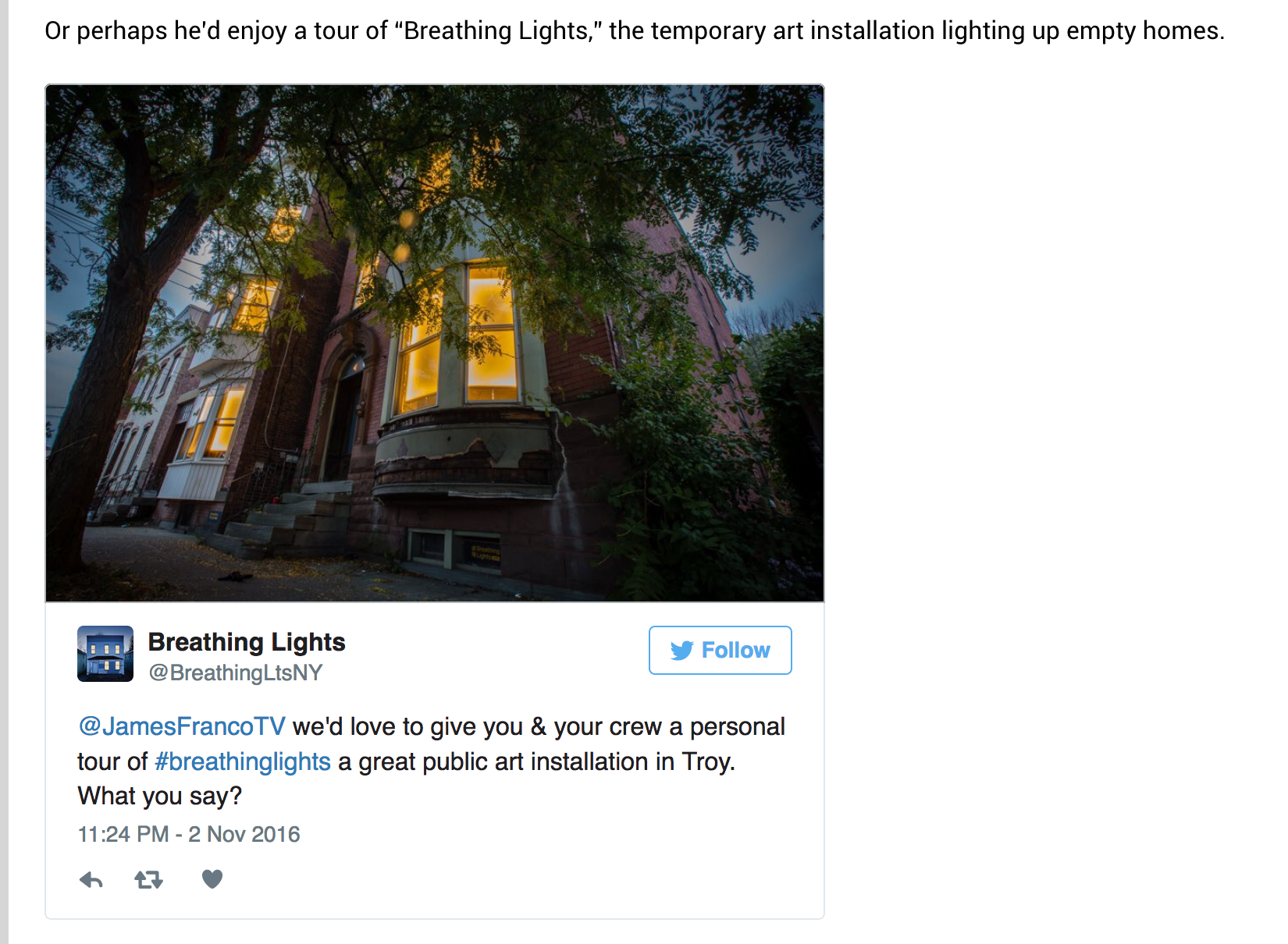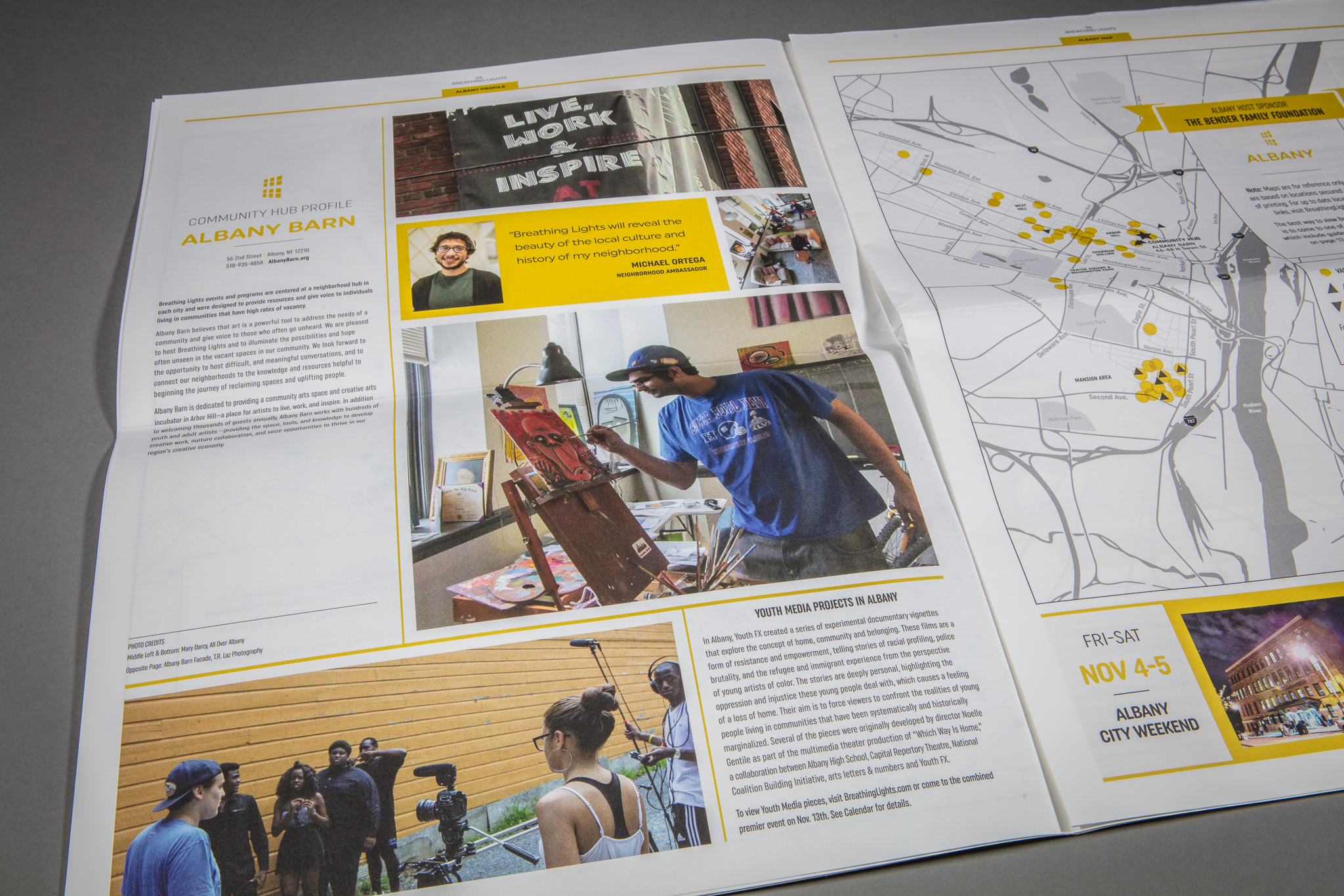 Breathing Light’s promotion and marketing strategy had two goals. First, to garner the attention of a large and diverse regional audience about the project and the issues surrounding vacancy. And second, to solicit participation of and provide resources to those living in the neighborhoods with the highest rates of vacancy. Accessing the project was free – anyone traversing neighborhood streets saw the illuminated buildings and participated in the experience. A robust marketing and PR campaign dove awareness and participation at neighborhood hubs and events. A project website and a widely distributed, 16-page Program Guide enhanced the visitor experience through rich content that included maps, photographs, quotes, and a calendar of events and resources for buying and redeveloping vacant properties.